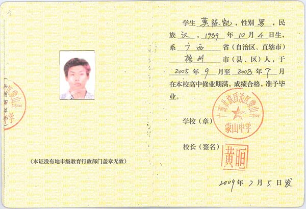 广西2009年高中毕业证样本(封皮+内芯全套)